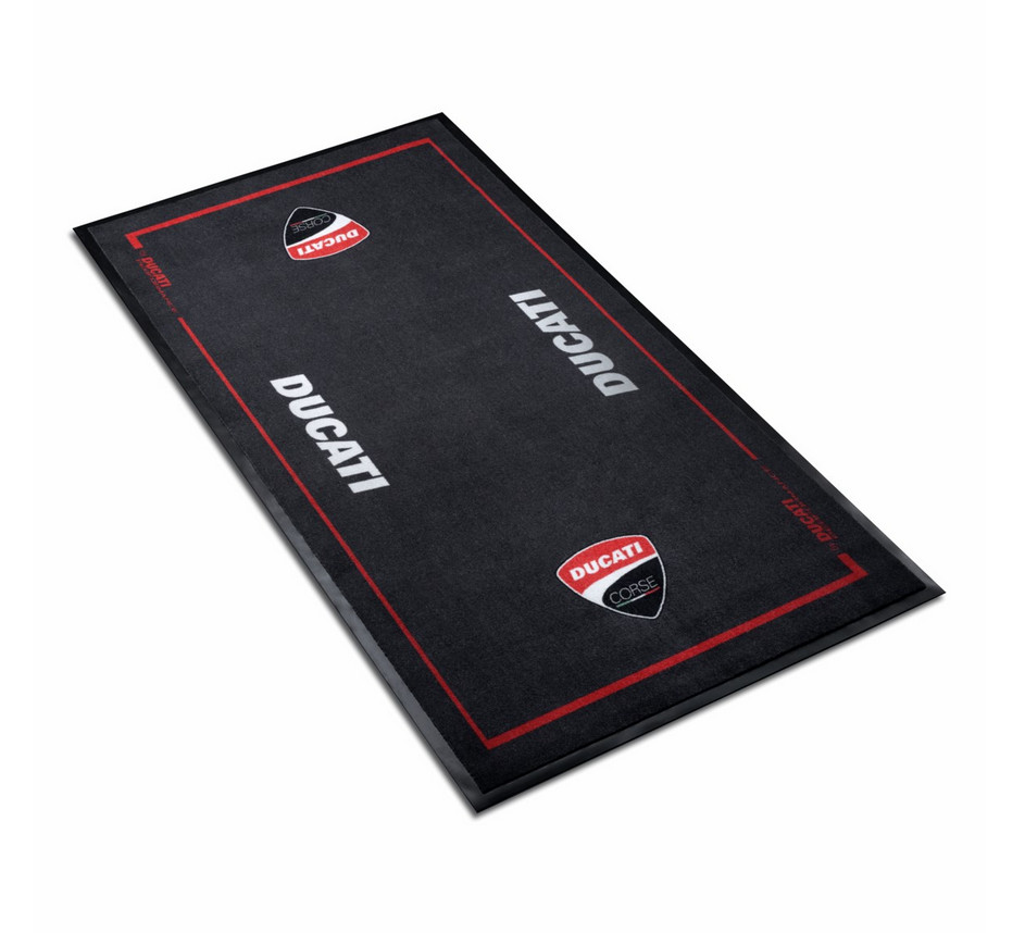 Exclusiva alfombra, ideal para talleres, garajes y boxes de competición, en la que se destacan los colores inconfundibles de Ducati Corse. La capa superior, de fieltro 100% poliamida, muy compacta y resistente, absorbe y retiene las posibles pérdidas, mientras que la inferior, de goma PVC impermeable, presenta un borde anticaída para la máxima seguridad. La selección y combinación minuciosa de los materiales, resistentes al aceite y combustible, garantiza durabilidad, creando un producto de calidad absoluta, ideal para aparcar la propia moto en el garaje o en el paddock. El diseño gráfico, de impresión digital, no crea espesor y mantiene inalteradas todas las características de absorción y suavidad del tejido. El accesorio perfecto para dar al garaje o al paddock un toque de profesionalidad que no pasará desapercibido. Conforme a las normativas FIM ENVIRONMENTAL 4.1 y FMI: Art.47