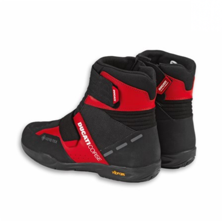 Las botas bajas Ducati Corse City C3, de look deportivo de inspiración racing, han sido desarrolladas por Held en exclusiva para Ducati. Adaptadas para un uso turístico y urbano durante la conducción de la moto, también son cómodas para dar un paseo de media distancia al llegar a destino. La empella es de piel y tejido técnico, mientras que la suela de goma Vibram® antideslizante y resistente a la abrasión, ofrece un confort máximo en cualquier circunstancia. El forro dotado de membrana Gore-Tex® es ligero, transpirable e impermeable, mientras que el tejido de poliéster proporciona al calzado un ajuste sumamente cómodo. Están dotadas de punta, talón y tobillo reforzados y de refuerzo para el cambio de marcha, lo que garantiza seguridad y protección durante la conducción. Prácticas para llevar, gracias al cierre con cremallera lateral y banda delantera de Velcro®, garantizan una vestibilidad rápida y segura en la zona del cuello del pie, a la vez que permiten excelentes niveles de flexibilidad. Por último, las aplicaciones de reflex otorgan una mayor visibilidad para la conducción nocturna. El accesorio perfecto para salir a descubrir nuevos destinos con el inimitable estilo Ducati en los pies.