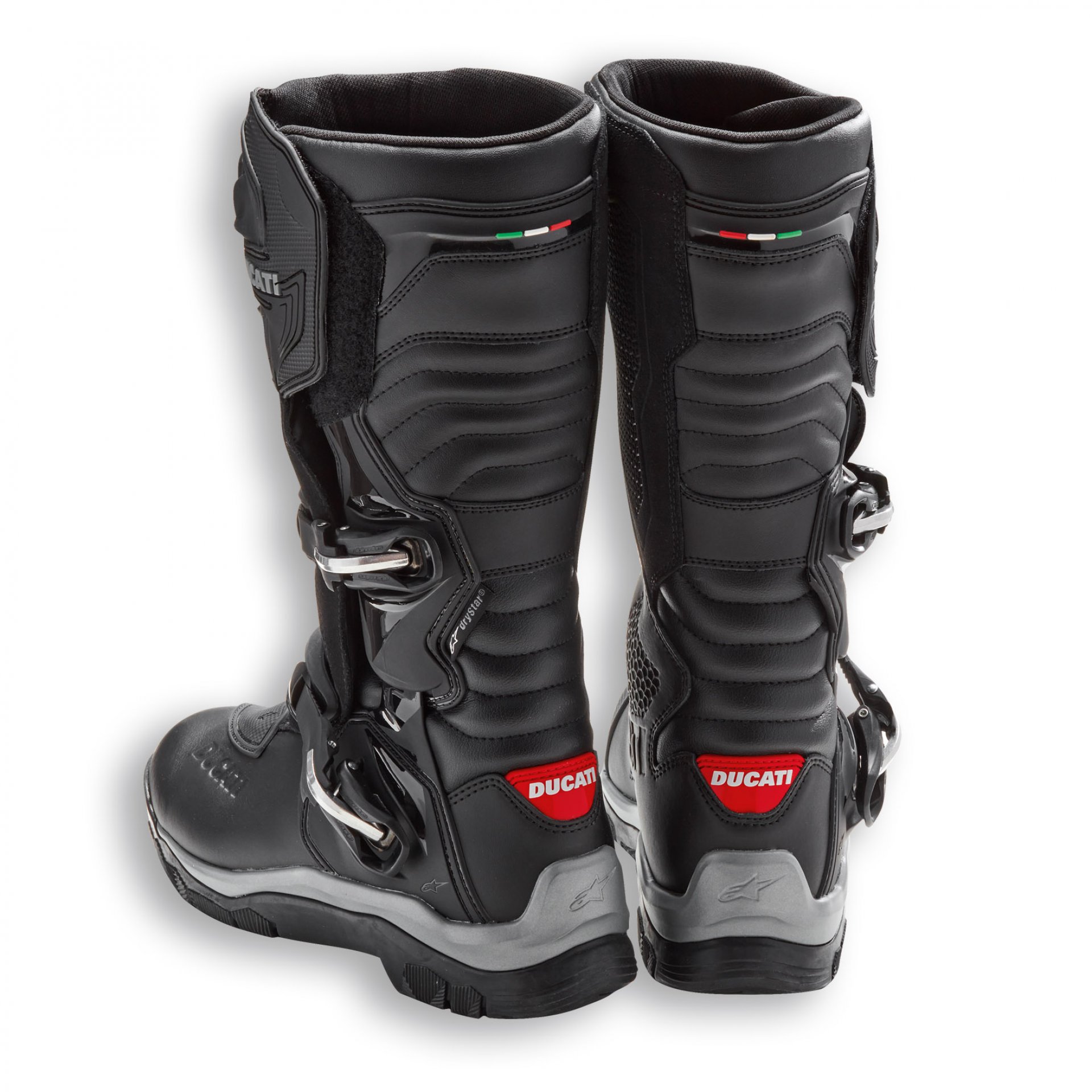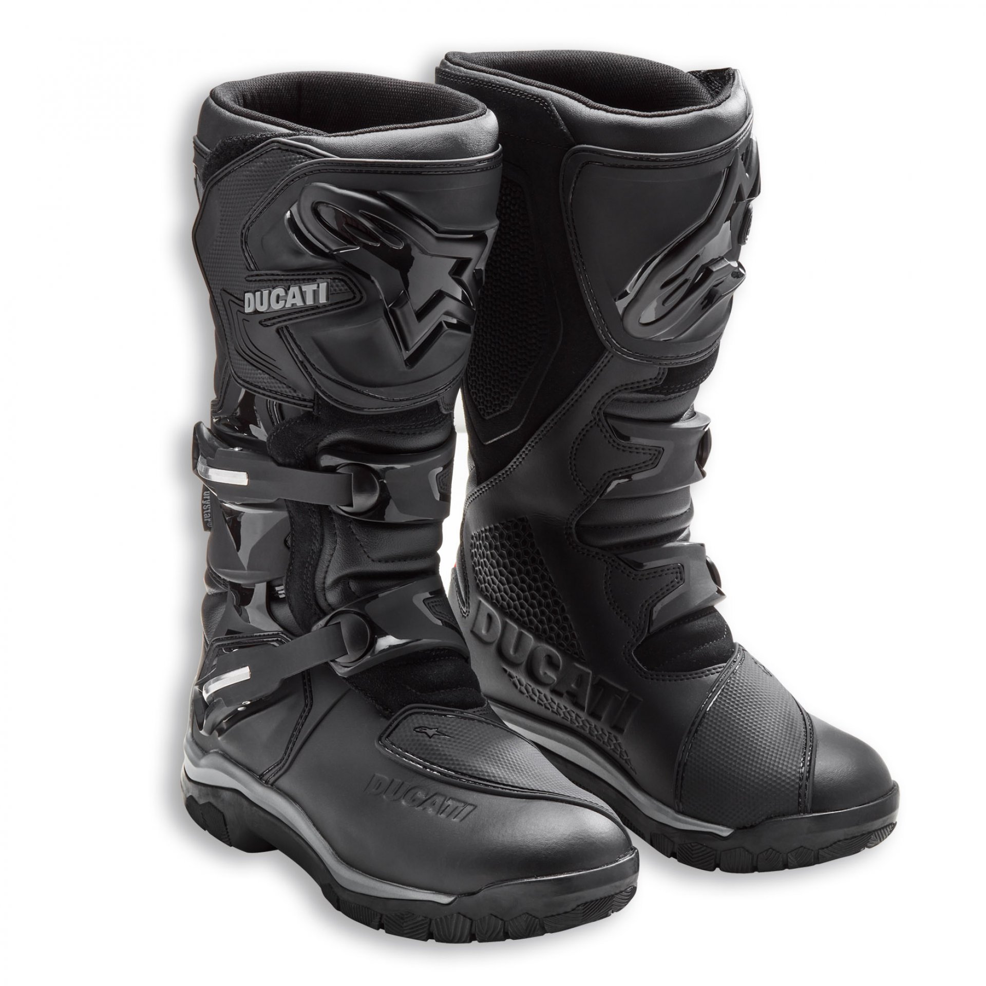 Las botas Atacama WP C2, fabricadas por Alpinestars con diseño Ducati, son específicas para el uso touring adventure. Realizadas con una combinación de materiales, como microfibra y piel gamuzada, están dotadas de todas las protecciones de referencia de la categoría, como la avanzada placa tibial polimérica y la innovadora protección del tobillo con enlace biomecánico de soporte entre calzado y cuello de las botas. Todos los componentes de las botas han sido estudiados para reducir el peso y mejorar las prestaciones en cualquier clima y terreno, desde la membrana transpirable integrada hasta la empella de microfibra/gamuzado combinado. Son certificadas según las normativas CE más recientes.
