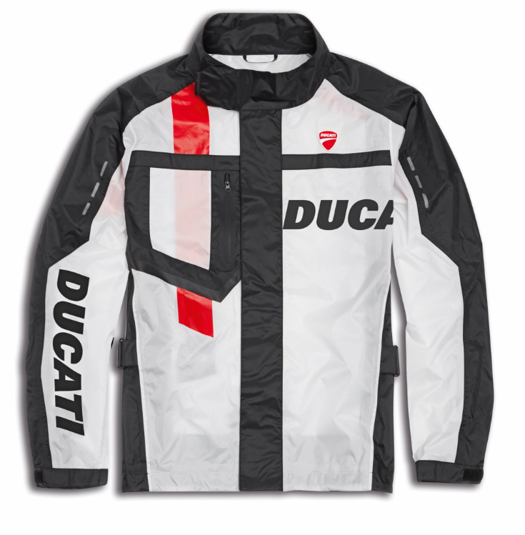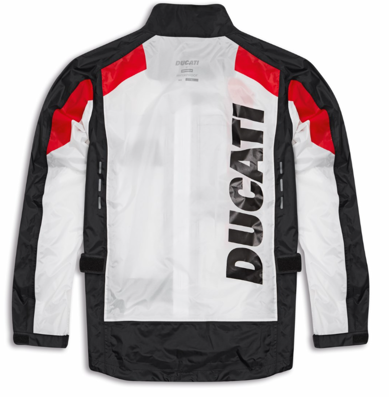 Las máximas dotaciones técnicas y prestaciones se unen a un diseño inconfundible en una chaqueta anti-lluvia, con el sello por Aldo Drudi y diseñada en exclusiva para Ducati siguiendo las instrucciones específicas de los probadores de las Rojas de Borgo Panigale. Realizada de poliéster y poliamida sin PVC, los dos tipos de material permiten evitar el cambio de color y mantener el aspecto original a lo largo del tiempo. Máxima impermeabilidad, de 10.000 columnas de agua, mejorada por las costuras internas termoselladas, por el doble cierre frontal con tecnología acqua-stop y por el amplio bolsillo externo impermeable, aplicado en el pecho con una técnica avanzada de encolado. Prenda ligera, resistente y sumamente práctica, se puede poner rápidamente y se dobla con facilidad en la riñonera específica. El ajuste de los volúmenes en los brazos y cadera y el doble cierre frontal maximizan el confort. Dotada de impresiones reflex y disponible en las versiones de color blanco/negro y amarillo HV/negro, para adaptarse al look de cada piloto y no renunciar al inconfundible estilo Ducati tampoco en las condiciones climáticas más adversas.