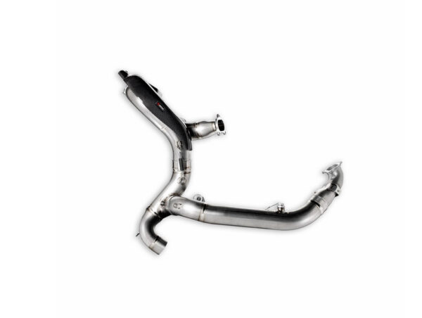 Del conocimiento técnico de Akrapovič en la construcción y de Ducati en el diseño nace un sistema de escape de muy altas prestaciones, creado en exclusiva para la Streetfighter V2. Los colectores, completamente realizados con una aleación especial de titanio y soldaduras de tipo TIG (Tungsten Inert Gas), garantizan la máxima ligereza y resistencia a las altas temperaturas. Dotados de un particular mapa del motor para responder a las exigencias especiales de la pista y ofrecer las máximas prestaciones, cuenta además con el protector calor de fibra de carbono y todas las piezas pequeñas necesarias para el montaje. El accesorio perfecto para convertir el par de silenciadores racing en un sistema completo ligero y eficiente.