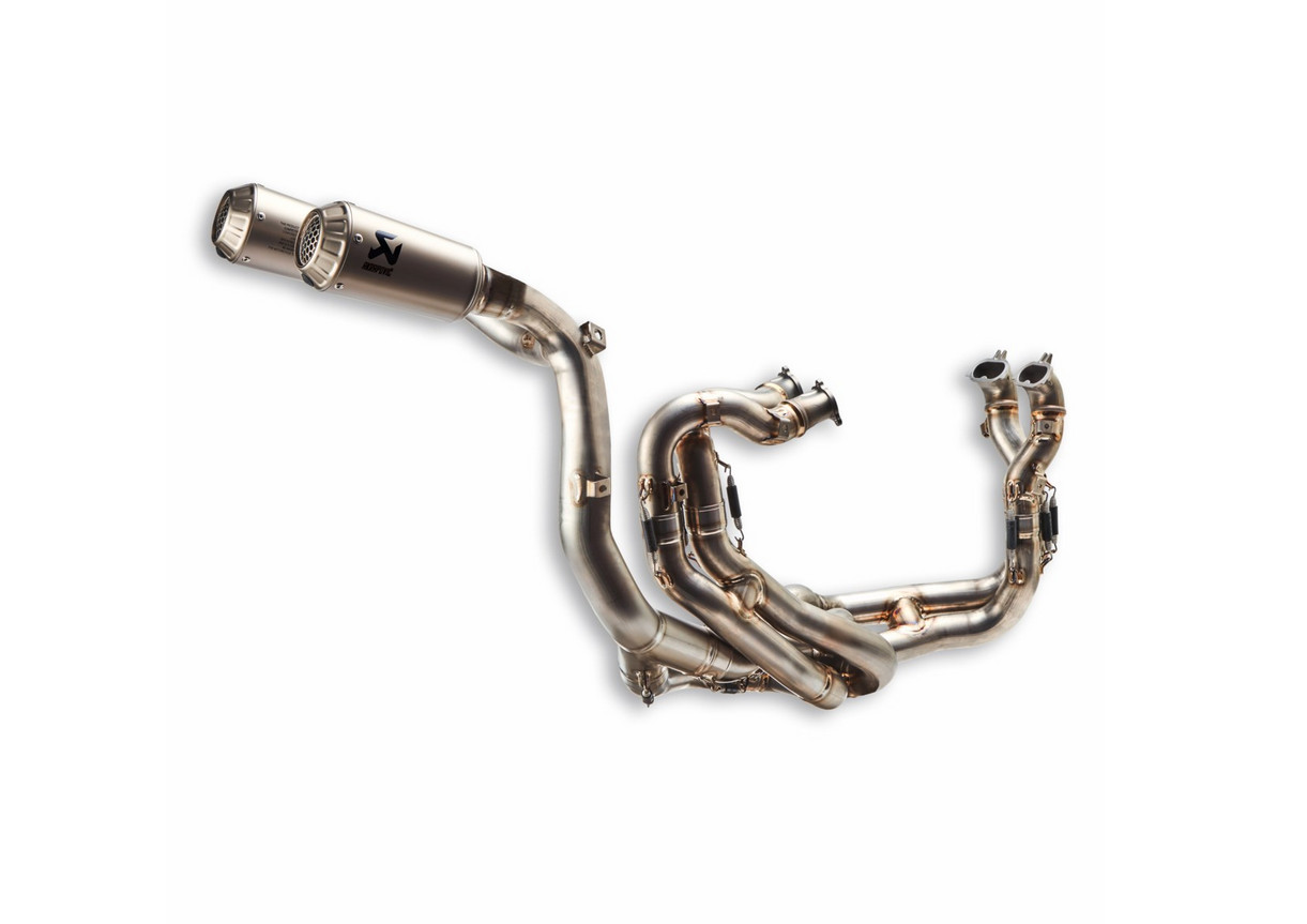 De los conocimientos constructivos de Akrapovič nace el grupo completo racing más avanzado del mercado. Este accesorio cumple con el límite fonométrico exigido en pista con el vehículo parado, con un nivel sonoro del escape inferior a 105 dB a 5500 rpm, según el reglamento FMI CIV SBK. Desarrollado por los técnicos de Ducati Corse, está destinado al uso en competiciones y circuitos que requieran dicha conformidad. Sin embargo, la conformidad con el límite fonométrico no afecta a las prestaciones, gracias al trabajo minucioso realizado en el par y la potencia, que ha permitido obtener mejoras durante todo su uso con la posibilidad de tener una moto lista para competir. Cada componente del sistema ha sido fabricado de aleación de titanio especial que permite una notable reducción de peso, además de ser particularmente resistente a las altas temperaturas generadas. El grupo de escape mejora considerablemente la relación ya elevada peso-potencia de la Streetfighter V4. Incluye filtro de aire de poliéster de derivación racing que, además de ser más permeable, garantiza un óptimo poder filtrante y un mantenimiento sencillo. Máximas prestaciones no solo gracias a los materiales racing, sino también a la cartografía suministrada, que permite adaptar todos los parámetros de DTC – DWC – DPL y DSC a las nuevas prestaciones de la moto. El doble silenciador debajo del asiento crea un diseño de la moto aún más particular y acentúa la estética inconfundible de la Streetfighter V4 con un toque adicional de agresividad. Una auténtica race-replica incluso del sonido inconfundible.
