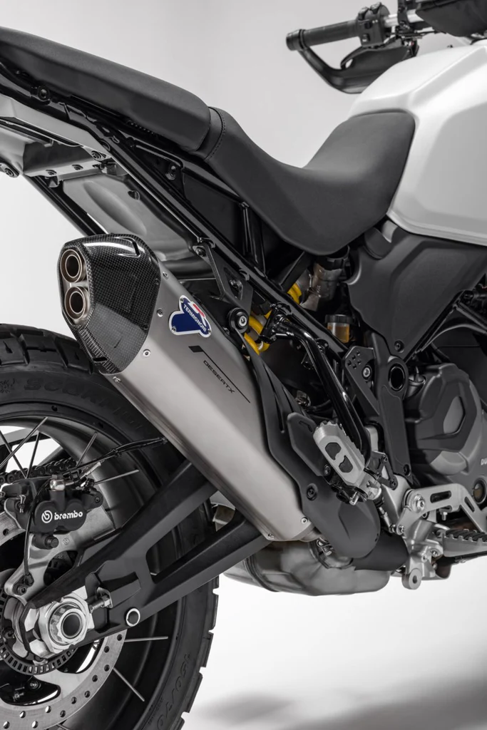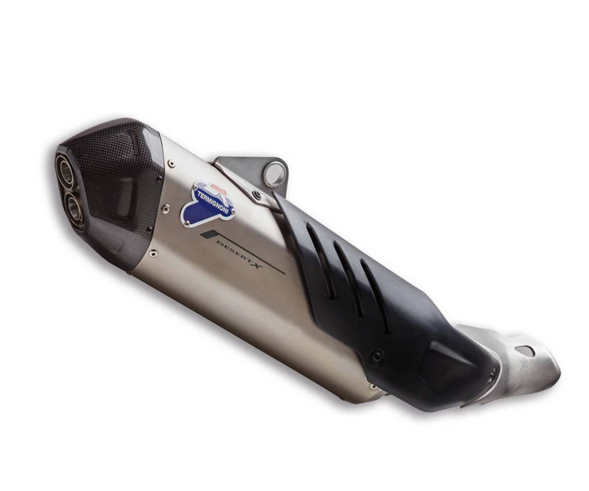 Silenciador homologado dotado de tapa de fibra de carbono y camisa de titanio, desarrollado para liberar todo el carácter deportivo de la nueva DesertX. Producido en colaboración con Termignoni, que por su diseño ofrece emociones a primera vista. Su aumento porcentual tanto en potencia como par de un 4%, hace que la experiencia de conducción sea aún más excitante.