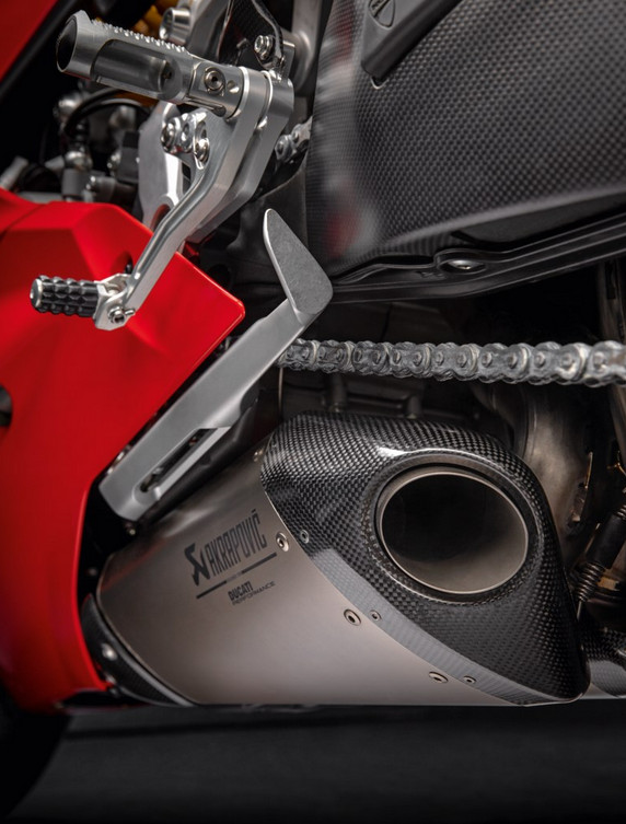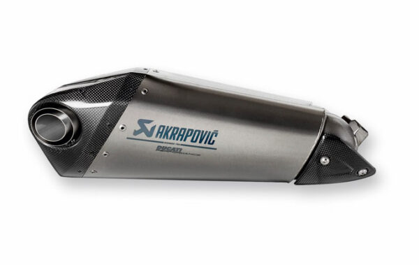 El inconfundible diseño Ducati se une al experimentado desarrollo constructivo de Akrapovič para obtener el máximo resultado que se puede exigir a un sistema slip-on. El escape, realizado completamente de titanio y desarrollado en colaboración con Ducati Corse, acentúa toda la fuerza de la Panigale y, además de un importante incremento en términos de par y potencia liberados, garantiza una reducción de peso con respecto al escape de serie. Incluye filtro de aire de poliéster de derivación racing, que, además de ser más permeable, garantiza un óptimo poder filtrante y un mantenimiento sencillo. Dotado de un particular mapa de motor para responder a las exigencias especiales del uso en pista y asegurar las máximas prestaciones.
