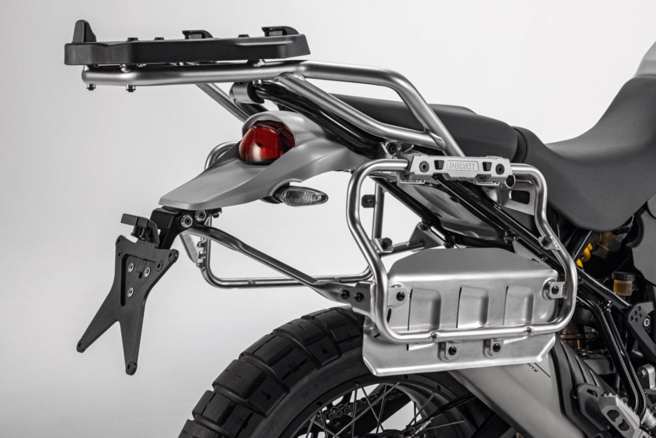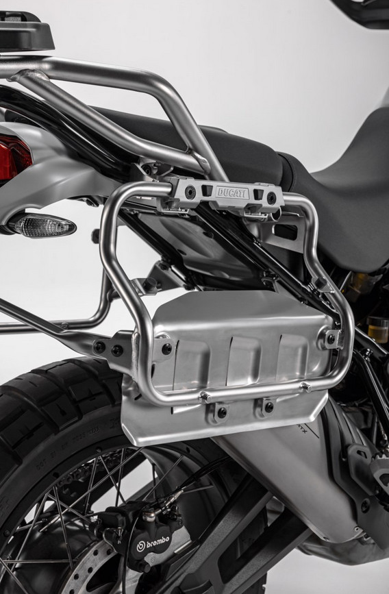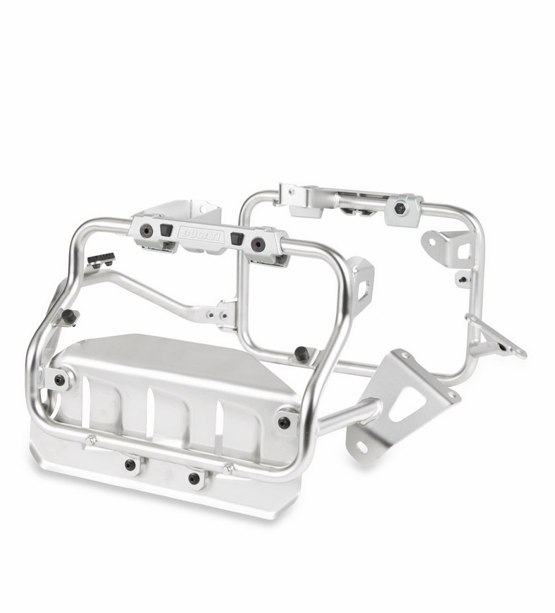Par de accesorios prácticos y resistentes que permiten el montaje de las maletas laterales de aluminio en la DesertX. Sistema realizado de acero inoxidable y dotado de una estructura sólida que ofrece una óptima estabilidad a las maletas laterales, garantizando al mismo tiempo la máxima facilidad de montaje.