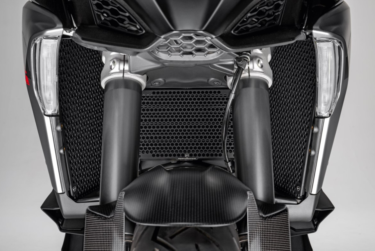Realizada de aluminio con anodización de alta calidad para conservar el aspecto original a lo largo del tiempo, garantiza una óptima protección del sistema de refrigeración contra los detritos, acentuando, al mismo tiempo, el look todoterreno de la moto.
